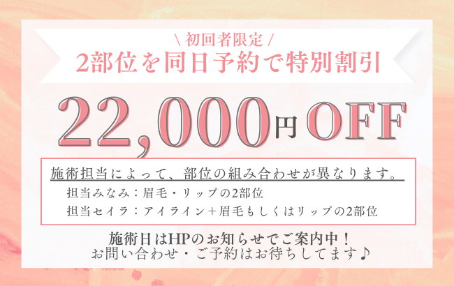 持続期間は年齢・肌質・新陳代謝などの違いにより個人差はありますが、施術完了から約2年ほどです。皮膚の深い層まで着色する刺青やタトゥーとは違い、約2年程で自然に消失するので、流行の変化や年齢に合わせて形や色などデザインを変更することも可能です。