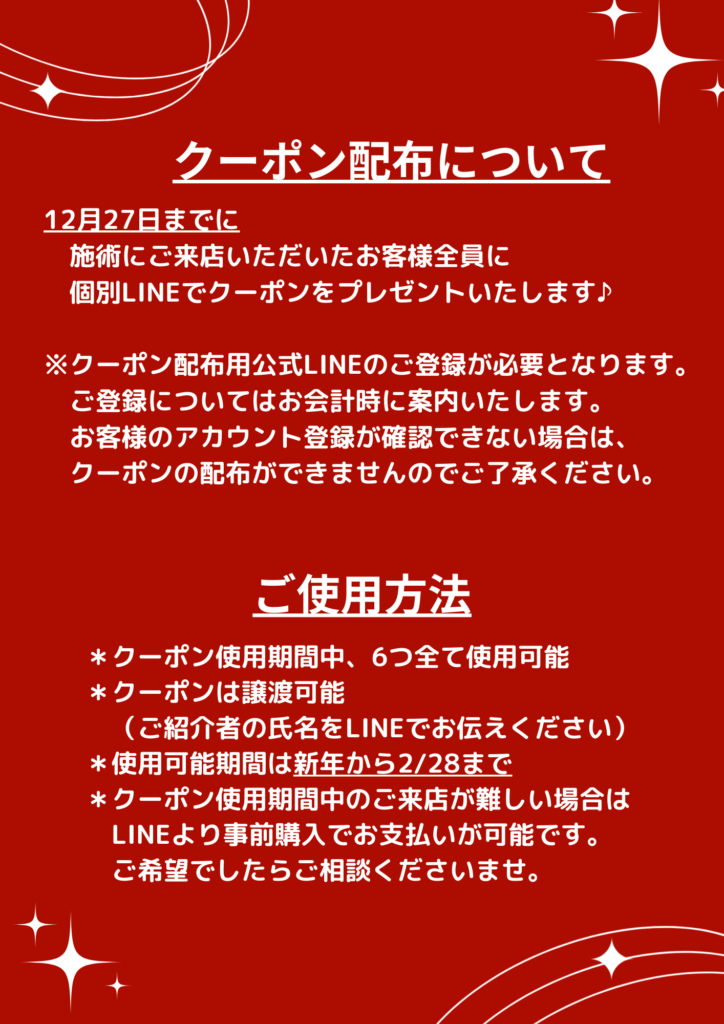 12月にご来店・ご予約いただいた全てのお客様限定で、【6つの特別クーポン】をプレゼント💕💕